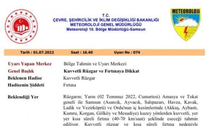 Meteoroloji 10. Bölge Müdürlüğü’nden Samsun’un iç kesimlerinde yer yer kuvvetli rüzgar ve fırtına uyarısı yapıldı. 2 Temmuz Cumartesi günü saat 09.00 ve 20.00 aralığında yaşanacak olumsuzluklara karşı dikkatli olunması vurgulandı.