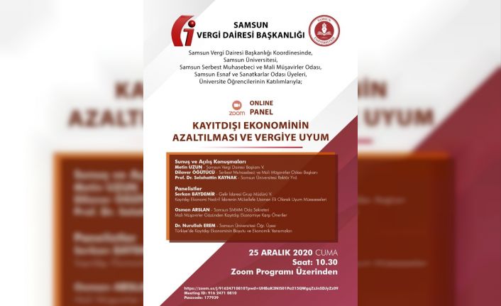 SAMSUN (İHA) – Samsun Vergi Dairesi Başkanlığı koordinesinde Samsun Üniversitesi (SAMÜ) ve Samsun Serbest Muhasebeci ve Mali Müşavirler Odası (SMMMO) Katkılarıyla, “Kayıt Dışı Ekonominin Azaltılması ve Vergiye Uyum” konulu online panel düzenlenecek.