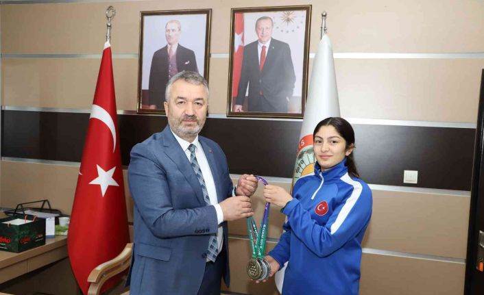 Başkan Topaloğlu, milli sporcu Sinem Özkan’ı altın ve çeşitli hediyeler ile ödüllendirdi.