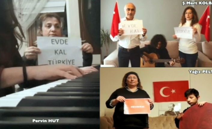 Öğrenciler ve veliler tarafından çekilen videolarda İstiklal Marşı değişik enstrümanlarla seslendirilirken, dövizlere ise evde kal Türkiye yazılarak, sosyal izolasyon mesajı verildi.
