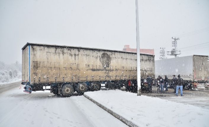 Samsun’da yoğun kar yağışı nedeniyle direksiyon hâkimiyetini kaybeden tır sürücüsü orta refüjdeki aydınlatma direklerini yıktı.
