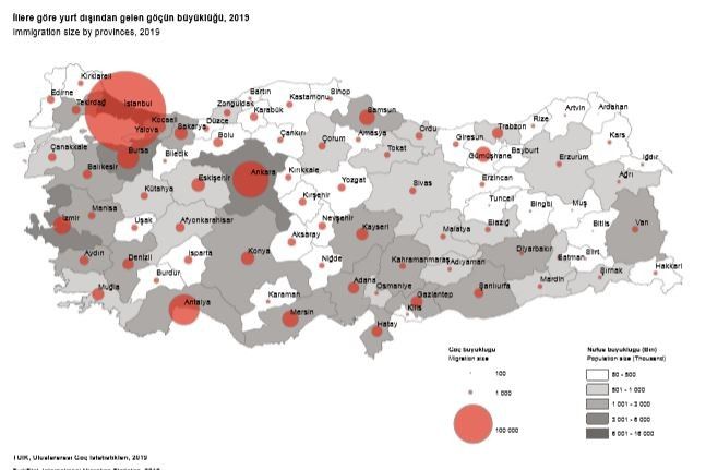 Yurt dışından Türkiye’ye göç edenlerin sayısı 2019 yılında, bir önceki yıla göre yüzde 17,2 artarak 677 bin 42 kişi oldu. Göç eden nüfusun yüzde 54,4’ünü erkekler, yüzde 45,6’sını ise kadınlar oluşturdu. Yurt dışından gelen nüfusun 98 bin 554’ünü Türkiye Cumhuriyeti(TC) vatandaşları, 578 bin 488’ini ise yabancı uyruklu nüfus oluşturdu. Türkiye’den yurt dışına göç eden kişi sayısı ise 2019 yılında bir önceki yıla göre yüzde 2 artarak 330 bin 289 oldu. Göç eden nüfusun yüzde 54,6’sını erkekler, yüzde 45,4’ünü ise kadınlar oluşturdu. Türkiye’den yurt dışına giden nüfusun 84 bin 863’ünü TC vatandaşları, 245 bin 426’sını ise yabancı uyruklu nüfus oluşturdu.