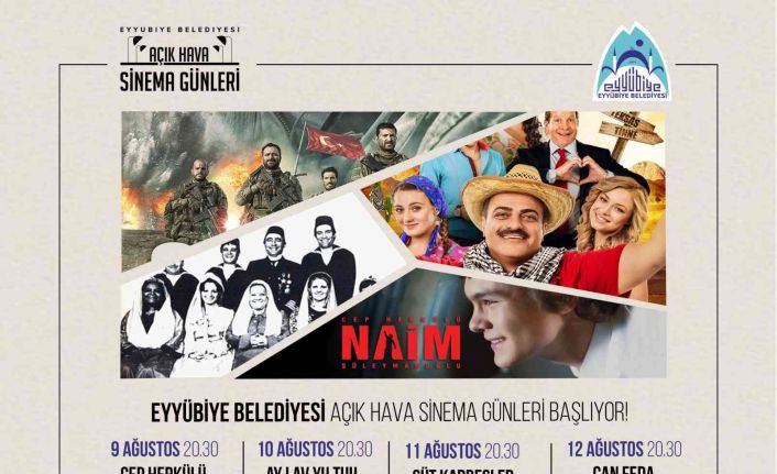Eyyübiye Belediyesi Kültür ve Sosyal İşler Müdürlüğünce organize edilen açık hava sinema günleri çerçevesinde her akşam ilçedeki bir parkta Türk sinemasının önemli eserleri gösterime girecek. Sıcak yaz akşamlarında halkın parklarda keyifli vakit geçirmesini sağlayacak sinema gösterimleri, her gün saat 20.30’da başlayacak. 9 Ağustos’ta Batıkent TOKİ Mahallesi’ndeki parkta Cep Herkülü Naim, 10 Ağustos’ta Direkli Muhtarlığı karşısındaki parkta Ay Lav YuTuu, 11 Ağustos’ta Mustafa Kuş Parkı’nda Süt Kardeşler ve 12 Ağustos’ta Eyyüp Peygamber makamı karşısındaki parkta Can Feda adlı filmler gösterime sunulacak.