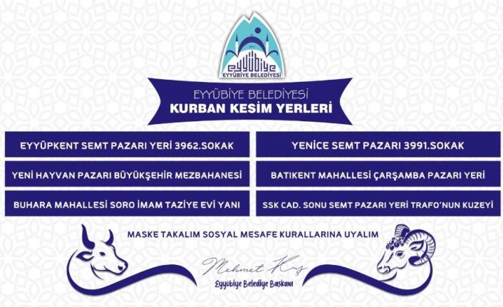 Eyyübiye Belediyesi kurban kesim yerleri, Yeni Hayvan Pazarı,Eyüp Peygamber Makamı Doğusu boş alan, Buhara Mahallesi Zeytinlik Otoparkının arkası, Direkli Mahallesi, S.S.K. CAD. Sonu ve elektrik trafosu kuzeyinde bulunan müsait alanda kurban kesimi yapılacak.