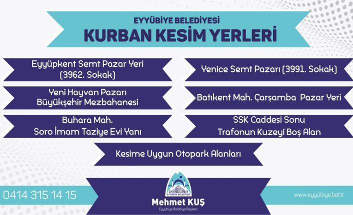 Eyyübiye belediyesi kurban kesim yerleri şöyle belirlendi, Yenice Semt Pazarı (3991. Sokak ), Batıkent Çarşamba Pazarı Yeri, SSK Caddesi sonu Trafonun kuzeyi boş alan , Eyüpkent Semt Pazarı Yeri ( 3962. Sokak ), Yeni Hayvan Pazarı Büyükşehir Mezbahanesi, Buhara Mahallesi Soro İmam Taziye Evi Yanı, Kesime uygun otopark alanları