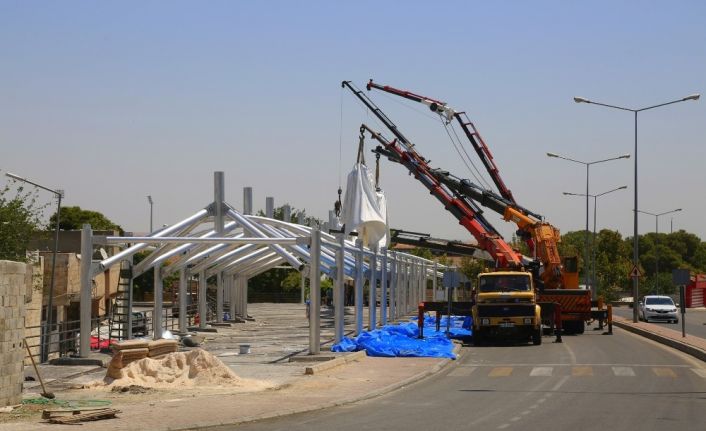 Eyyübiye Belediyesi ilçenin önemli ihtiyaçlarından biri olan kapalı semt pazarlarının yapımında sona geldi. Harran Kapı bölgesinde bin 600 metre karelik alanı kapsayacak şekilde tasarlanan kapalı semt pazarı yükselmeye devam ediyor. İlçe sakinlerinin önemli taleplerinden biri olan kapalı semt pazarı için düğmeye basan ve temel atma töreni gerçekleştirilmeden yapımına başlanılan alanda artık son çalışmalar yapılıyor. Toplam 3 mahallenin semt pazarı ihtiyacını giderecek şekilde tasarlanan proje ile bölgenin önemli bir eksikliği giderilecek. Bölgenin mimari yapısı da dikkate alınarak tasarlanan kapalı semt pazarı, tek seferde 160 pazar tezgahını içinde barındıracak şekilde dizayn edildi. Modern yapı malzemelerinin kullanıldığı kapalı semt pazarında asma-germe membran işlemini yapan ekipleri, semt pazarını açılışa hazır hale getirmeye çalışıyor. Konuyla ilgili açıklama yapan Eyyübiye Belediye Başkanı Mehmet Kuş, "İlçemizin önemli eksikliklerinden bir olan kapalı semt pazarları için çalışmalarımız hummalı bir şekilde sürüyor. İnşallah kısa sürede açılışını yapıp bölge halkının hizmetine sunacağız. İlçe genelinde kapalı semt pazarı yapımı için de çalışmalarımız devam ediyor. İhtiyaç duyulan bölgelerde belirlenen alanlara semt pazarı yapımına da başlayacağız” diye konuştu.