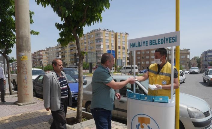 Haliliye Belediyesi korona virüs salgınından korunma tedbirleri kapsamında ilçede kurduğu stantlarda maske dağıtımı yapıyor.