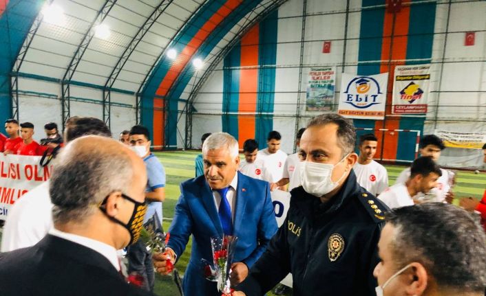 Maçı organize eden derneğin Başkanı İbrahim Kaça, gayelerinin madde bağımlısı gençleri sokaklardan toplayıp topluma kazandırmak ve spora teşvik etmek olduğunu söyledi. Bu nedenle spor müsabakaları düzenlediklerini belirten Kaça, Polis Haftası nedeni ile müsabakaya Katılan İlçe Emniyet Müdürlüğü personeline karanfil verdi. İlçe Emniyet Müdürü Hakan Uzundağ’a ilçede yaptıkları başarılı çalışmalarında dolayı plaket takdim eden Kaça, ayrıca pandemi döneminde canla başla mücadele eden sağlık çalışanlarını da unutulmayarak teşekkür etti.