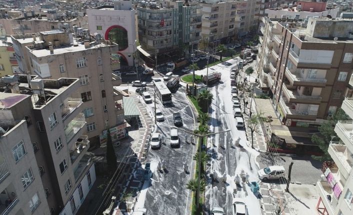 Haliliye Belediyesi, Yunus Emre Caddesini deterjanlı köpüklü su ile yıkayarak dezenfekte etti.