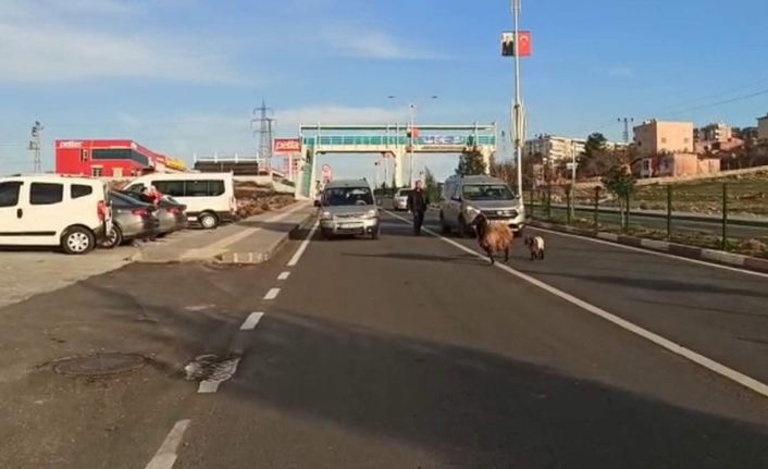 Siirt’te sürüden ayrılan koyun ve yavrusu karayoluna çıkarak trafiği birbirine kattı. Koyun ve yavrusu, duyarlı vatandaşın aracını durdurup inerek hayvanlara yol vermesi ile kaldırıma çıktı.