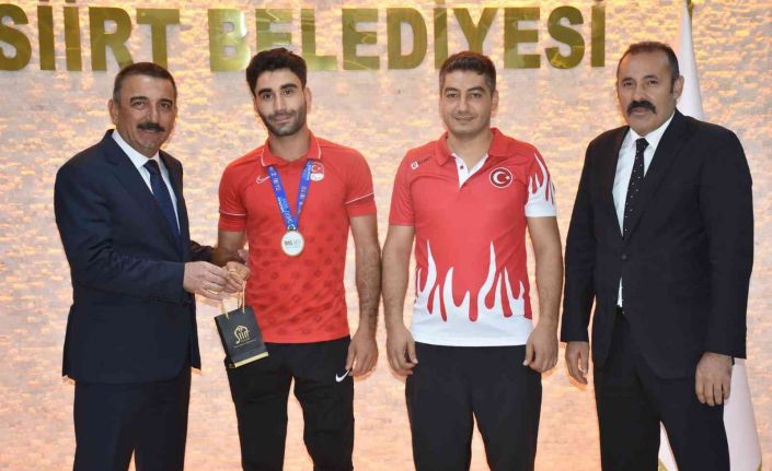 Vali Hacıbektaşoğlu, milli sporcu Abdürrahim Özalp, Siirt Gençlik ve Spor İl Müdürü Hayati Kısacık ve Antrenör Selami Ünal’ı Siirt Belediyesindeki makamında kabul etti.