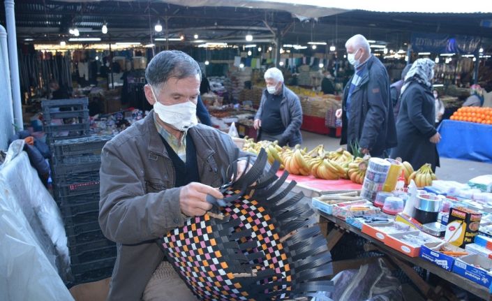 Sinop’ta yaşayan 59 yaşındaki İrfan Yayla, 15 senedir beyaz eşya ve inşaat malzemelerinin paketlemesinde kullanılan şeritlerden pazar çantası yaparak satışa sunuyor.