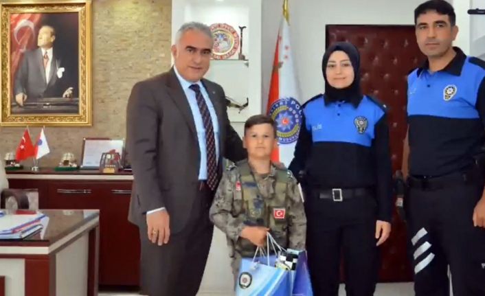 Sinop’ta 9 yaşındaki Halit’in özel harekât polisi üniformasını giyme hayalini İl Emniyet Müdürlüğü ekipleri yerine getirdi. Üniforması ile Toplum Destekli Polislik Şube Müdürlüğü ekiplerince misafir edilen minik Halit, Emniyet Müdürlüğü’nde birimleri gezdi. Haber merkezinde anonsa katılan Halit, ardından Olay Yeri İnceleme ve Çevik Kuvvet birimlerini inceledi. Bir gününü polislerle birlikte geçiren Halit’e Sinop İl Emniyet Müdürü Tarıkhan Çetiner tarafından hediye verildi.