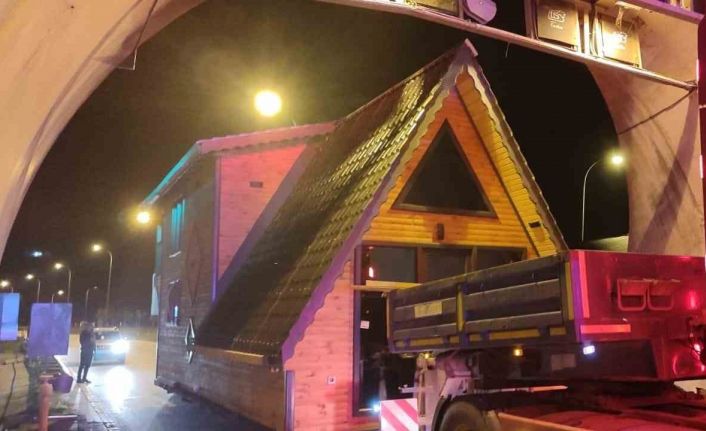 Sinop’ta bungalov ev taşıyan tır, geçmeye çalıştığı tünelin girişine takıldı.