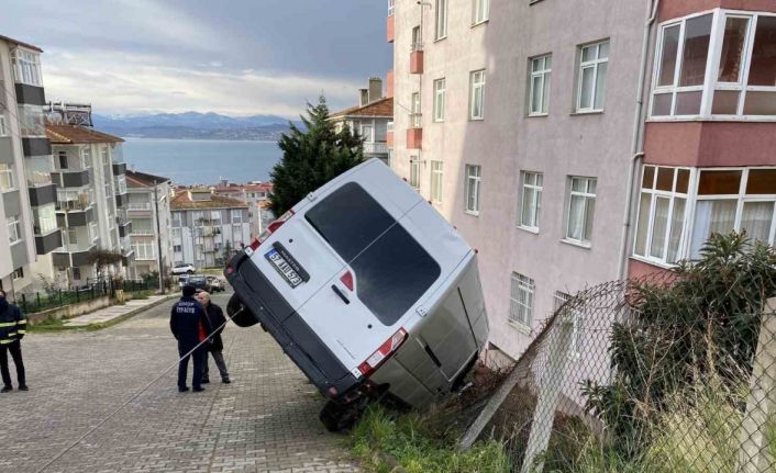 Sinop’ta çalıştırmak için yokuş aşağı itilen minibüs kontrolden çıktı, bahçe tellerinde asılı kalarak apartman bahçesine düşmekten son anda kurtuldu.
