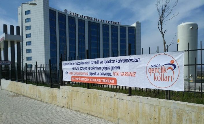 AK Parti Gençlik Kolları tarafından, Sinop Atatürk Devlet Hastanesi bahçesine “Korona virüs ile mücadelemizin özverili ve fedakar kahramanları her türlü zorluğa ve sıkıntıya göğüs geren tüm Sağlık çalışanlarımıza teşekkür ediyoruz. İyi ki varsınız” yazılı pankart asıldı.