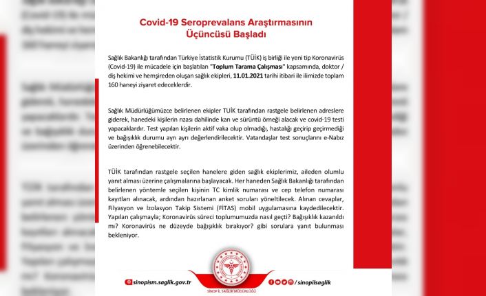 Sinop İl Sağlık Müdürlüğü tarafından yapılan açıklamaya göre ekipler TÜİK tarafından rastgele belirlenen adreslere giderek, hanedeki kişilerin rızası dahilinde kan ve sürüntü örneği alacak ve Kovid-19 testi yapacaklar. Test yapılan kişilerin aktif vaka olup olmadığı, hastalığı geçirip geçirmediği ve bağışıklık durumu ayrı ayrı değerlendirilecek. Vatandaşlar test sonuçlarını e-Nabız üzerinden öğrenebilecek.