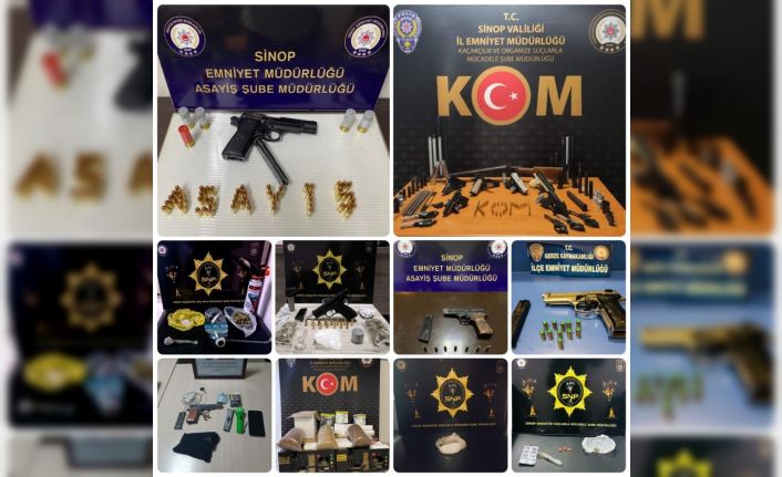 Sinop İl Emniyet Müdürlüğü tarafından 2022 yılı Kasım ayı raporu yayımlandı. Yapılan açıklamaya göre, 42 aranan şahıs yakalandı, 16 şahıs tutuklandı, 16 adet ruhsatsız tabanca, 1 adet tüfek, 5 adet fişek,184 adet mermi, 68 bin 400 adet makaron, 20 kg kıyılmış tütün, 111,91 gr metamfetamin, 69,67 gr esrar, 30 adet sentetik ecza maddesi ele geçirildi.