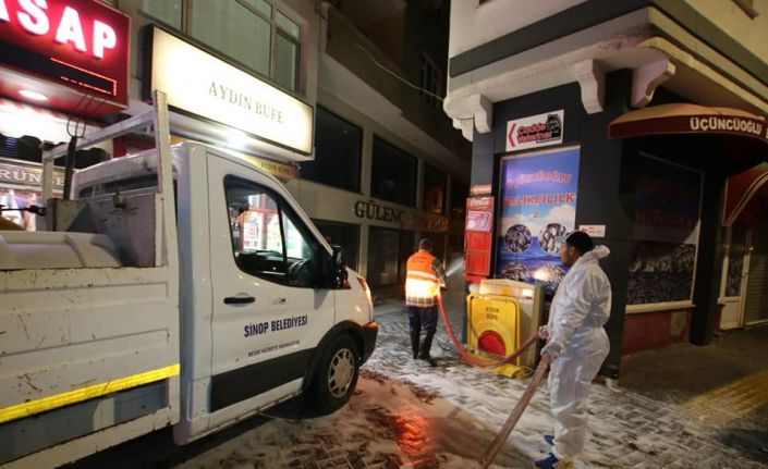 Sinop Belediyesi’nden yapılan açıklamada, "Belediye Başkanlığımızca her geçen gün etkisi artarak büyüyen ve ülkemizde de görülen korona virüsüne (Kovid-19) önlem amaçlı toplu kullanım alanları başta olmak üzere dezenfekte işlemleri devam ediyor. Korona virüs pandemisiyle mücadelemizi aralıksız sürdürüyoruz. Temizlik İşleri Müdürlüğü ekiplerimiz, Sakarya Caddesi, Kıbrıs Caddesi ve Meydankapı Mahallesi Kaledibi Aralığı Sokak’ta yıkama ve dezenfeksiyon çalışması yürüttü. Korona virüse karşı birlikte savaşacak, birlikte başaracağız” ifadelerine yer verildi.