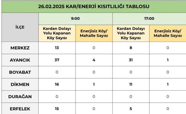 Sinop Valiliği’nden yapılan açıklamada, etkili olan kar yağışı sebebiyle, Merkez’de 8, Ayancık ilçesinde 31, Dikmen’de 11, Erfelek’te 5, Gerze’de 18, ve Türkeli’nde 4 köy yolu olmak üzere toplamda 77 köy yolunun ulaşıma kapalı olduğu bildirildi. Sinop İl Özel İdaresi ekipleri, kapalı köy yollarının tekrardan ulaşıma açılması için çalışmaların aralıksız sürdürüyor. Öte yandan, Ayancık ilçesinde 1, Dikmen ilçesinde 1 köye elektrik verilemediği belirtildi.
