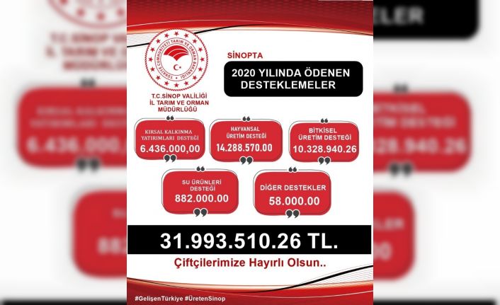 Sinop İl Tarım ve Orman Müdürlüğü tarafından yapılan açıklamaya göre, çiftçilere 6 milyon 436 bin TL ‘kırsal kalkınma yatırımları desteği’, 14 milyon 288 bin 570 TL ‘hayvansal üretim desteği’, 10 milyon 328 bin 940,26 TL ‘bitkisel üretim desteği’, 882 bin TL ‘su ürünleri desteği’ ve 58 bin TL ‘diğer destekler’ adı altında 2020 yılında toplam 31 milyon 993 bin 510,26 TL destekleme ödemesi yapıldı.