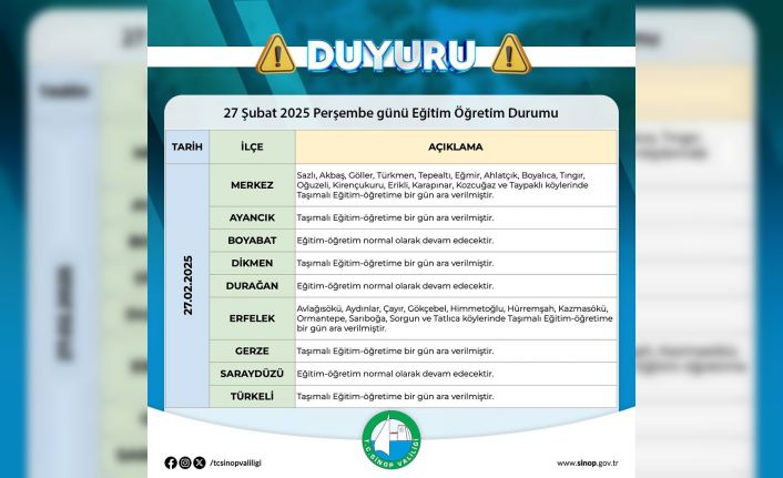 Valilikten yapılan duyuruya göre, Ayancık, Dikmen, Gerze ve Türkeli ilçelerinde taşımalı eğitim - öğretime bir gün ara verildi. Ayrıca, Merkez İlçeye bağlı; Sazlı, Akbaş, Göller, Türkmen, Tepealtı, Eğmir, Ahlatçık, Boyalıca, Tıngır, Oğuzeli, Kirençukuru, Erikli, Karapınar, Kozcuğaz ve Taypaklı köyleri ile Erfelek İlçesine bağlı; Avlağısökü, Aydınlar, Çayır, Gökçebel, Himmetoğlu, Hürremşah, Kazmasökü, Ormantepe, Sarıboğa, Sorgun ve Tatlıca köylerinde taşımalı eğitim - öğretime bir gün ara verildi.