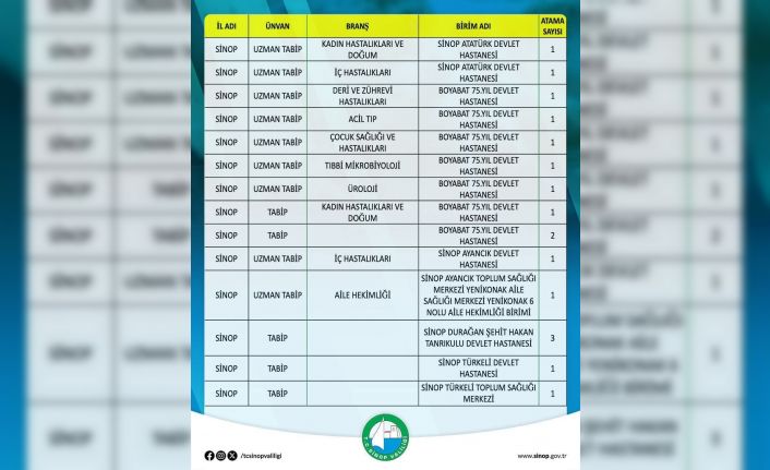 Türkeli Devlet Hastanesi: 1 pratisyen tabip. Ayancık Yenikonak Aile Sağlığı Merkezi’ne 1 aile hekimliği uzmanı ve Türkeli Toplum Sağlığı Merkezi’ne 1 pratisyen tabip görevlendirildi.
