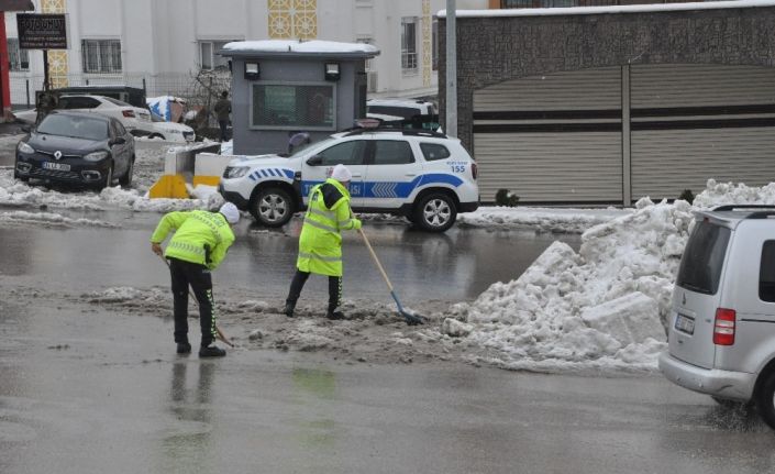 Polisler ellerine kürek aldı, yolda biriken kar birikintilerini temizledi