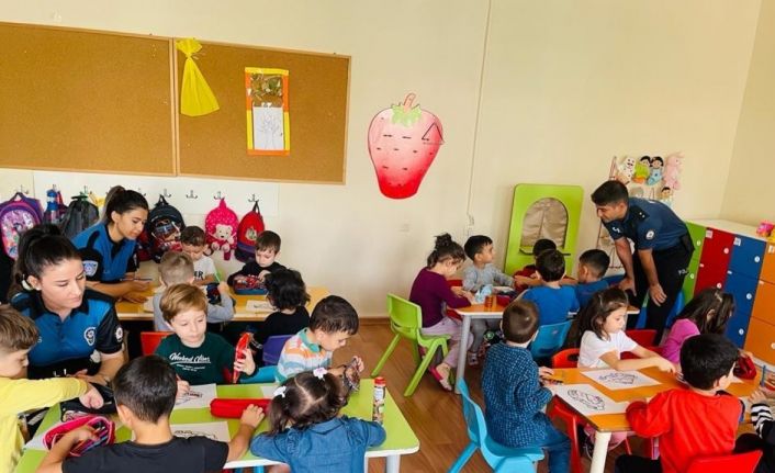 Bilgilendirme yapıp çocuklarla boyama ve oyunlar oynayan polisler etkinliğin sonunda, anaokulu öğrencilerine çeşitli hediyeler dağıttı.