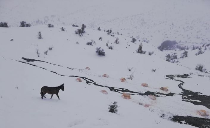 Şırnak’ın Uludere ilçesinde yoğun kar yağışının ardından yiyecek bulmakta zorlanan yaban hayvanları için doğaya yem bırakıldı.