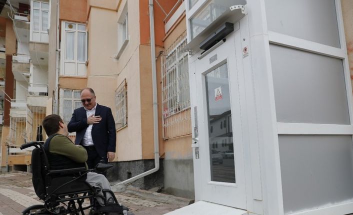 Sivas Belediye Başkanı Hilmi Bilgin, bir apartmanın ikinci katında yaşayan fiziksel engelli vatandaş için engelli asansörü yaptırdı.