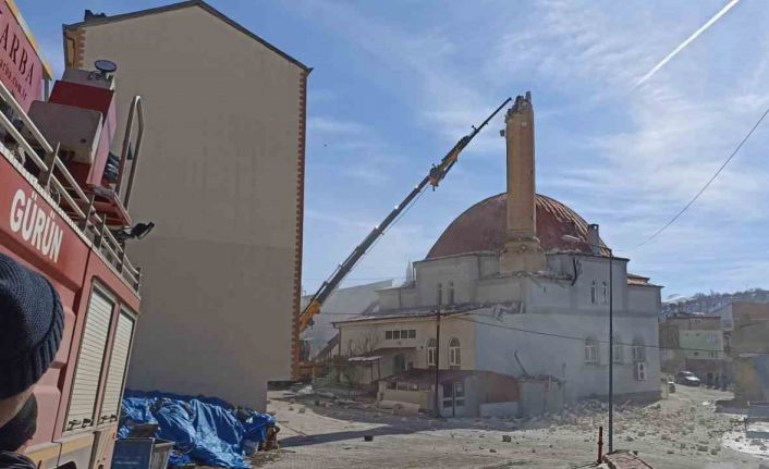 Sivas’ın Gürün ilçesinde depremden etkilenin camilerin hasar gören minareleri kontrollü olarak yıkılıyor.