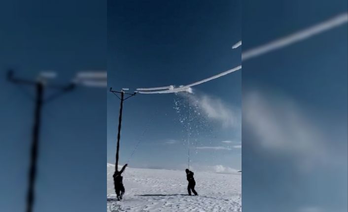 Sivas’ın Gürün ve İmranlı ilçelerinde şiddetli fırtına ve kar yağışı nedeniyle nakil hatlarında oluşan buz yükü arızalarına karşı ekiplerin buzları temizleme mesaisi cep telefonu kamerasına yansıdı.