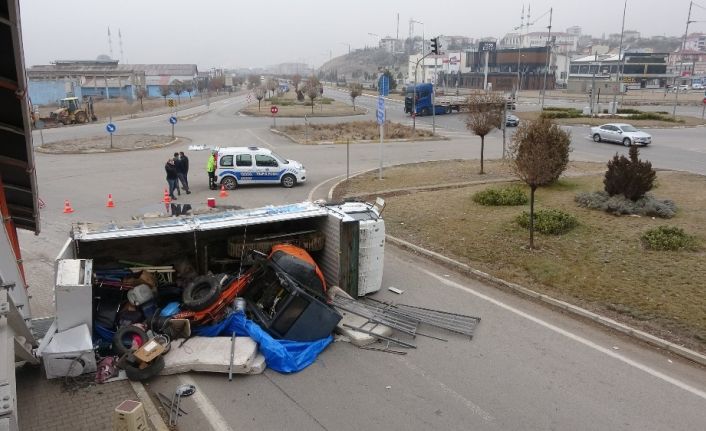 Sivas’ta freni boşalan kamyon kavşakta devrildi.