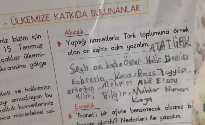 Sivas’ta ikinci sınıf öğrencisi Haktan Aktaş “Hizmetlerle Türk Toplumuna Örnek Olmuş Kişiler” konulu ödevde; Mustafa Kemal Atatürk, Recep Tayyip Erdoğan, Seyit Onbaşı, Mehmet Akif Ersoy, Fahrettin Koca, Ömer Halis Demir, Sivas Belediye Başkanı Hilmi Bilgin ve 4 Eylül Mahallesi Muhtarı Numan Kaya’yı konu etti. Ödevden haberden olan Dört Eylül Mahalle Muhtarı Numan Kaya’ya konuyu Belediye Başkanı Hilmi Bilgin’e aktırdı. Bilgin Haktan ile tanışmak için küçük çocuğun ailesini ziyaret etti. Neslihan ve Turgay Aktaş çiftinin Mevlana Mahallesi’nde bulunan evlerini Muhtar Kaya ile ziyaret eden Başkan Bilgin, Kızılırmak İlköğretim Okulu Öğrencisi Haktan Aktaş ile tanıştı. Küçük Haktan ile bir süre sohbet eden Hilmi Bilgin, “Haktan’ın sorulan soruya verdiği cevaplar oldukça güzel; başta Ülkemizin Kurucusu Atatürk, Çanakkale Kahramanımız Seyit Onbaşı, İstiklal Marşı Şairimiz Mehmet Akif Ersoy, 15 Temmuz’un dönüm noktasında bulunan Ömer Halis Demir, Cumhurbaşkanımız Recep Tayyip Erdoğan ve Muhtarımız Numan Kaya” ifadesini kullandı. Ziyaretin anısına Başkan Bilgin, küçük Haktan’a çeşitli hediyeler verirken, Haktan Aktaş‘da Belediye Başkanı Hilmi Bilgin’e isimlik hediye etti.