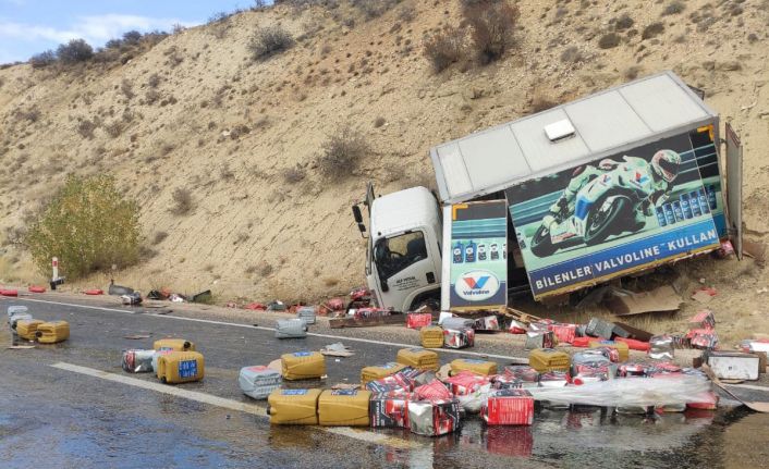 Sivas’ın Gürün ilçesinde madeni yağ dolu kamyon devrildi, yağlar yola saçıldı.