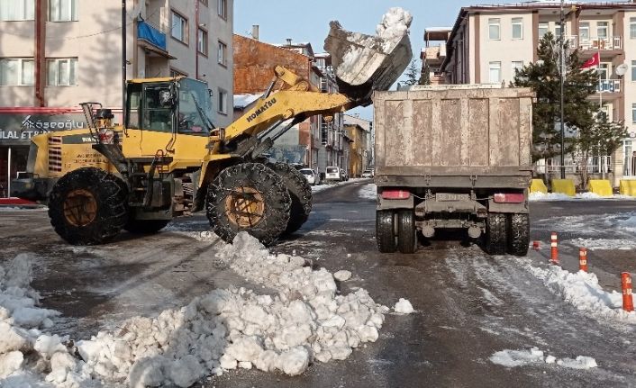 Sivas’ta karla mücadele ekipleri tarafından kaldırılan kar kütleleri kamyonlarla kent merkezi dışına taşınıyor.