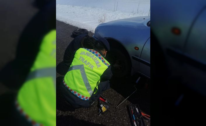 Sivas’ın Şarkışla ilçesinde telefonların çekmediği bölgede aracının lastiği patlayan vatandaşın yardımına jandarma ekipleri yetişti.