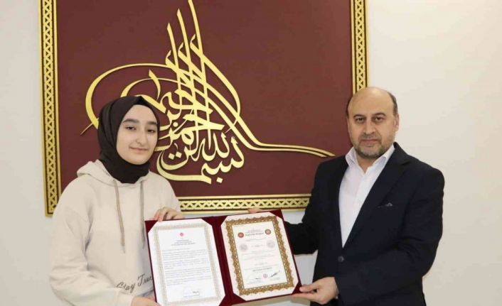 Hafızlık belgesini almak için ailesiyle birlikte Sivas İl Müftülüğünü ziyaret eden Hafız Duman’ın belgesini İl Müftü Yardımcısı Muttalip Karataş teslim etti.