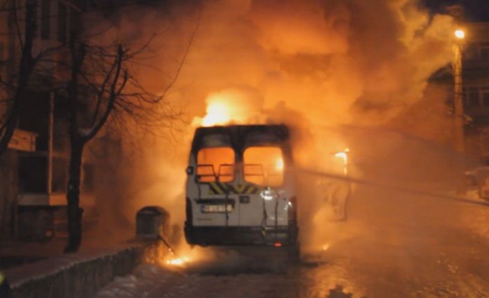 Sivas’ta park halindeki minibüsün alev alev yandığı anlar kameralara yansıdı.