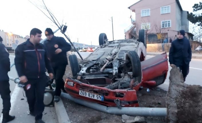 Sivas’ın Suşehri ilçesinde refüje çıkıp aydınlatma direğine çarptıktan sonra ters dönen otomobilin sürücüsü yaralandı.
