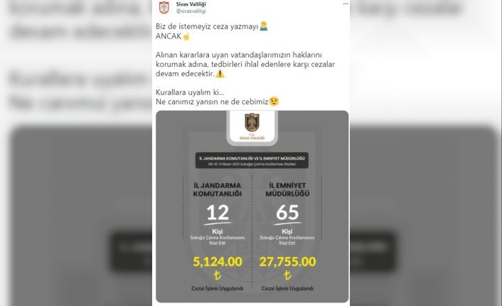 Sivas Valiliği söz konusu sosyal medya paylaşımında, “Biz de istemeyiz ceza yazmayı ancak alınan kararlara uyan vatandaşlarımızın haklarını korumak adına, tedbirleri ihlal edenlere karşı cezalar devam edecektir. Kurallara uyalım ki... Ne canımız yansın ne de cebimiz” ifadelerine yer verdi.
