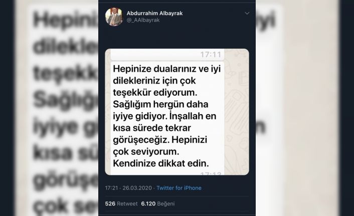 Koronavirüs testi pozitif çıkan ve tedavisine başlanan Galatasaray İkinci Başkanı Abdurrahim Albayrak, sağlık durumu hakkında bilgi verdi. Albayrak, sosyal medya hesabından yaptığı açıklamada, "Hepinize dualarınız ve iyi dilekleriniz için çok teşekkür ediyorum. Sağlığım her gün daha iyiye gidiyor. İnşallah en kısa sürede tekrar görüşeceğiz. Hepinizi çok seviyorum. Kendinize dikkat edin” ifadelerine yer verdi.