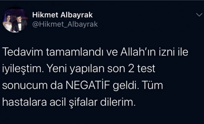 "Tedavim tamamlandı ve Allah’ın izni ile iyileştim. Yeni yapılan son 2 test sonucum da NEGATİF geldi. Tüm hastalara acil şifalar dilerim."