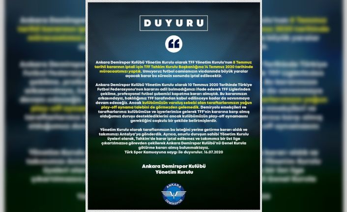 "Ankara Demirspor Kulübü Yönetim Kurulu olarak TFF Yönetim Kurulu’nun 8 Temmuz tarihli kararın iptali için TFF Tahkim Kurulu Başkanlığı’na 14 Temmuz 2020 tarihinde müracaatımızı yaptık. Umuyoruz ki futbol camiamızın vicdanında büyük yaralar açacak karar bu sürecin sonunda iptal edilecektir. Ancak kulübümüzün varoluş sebebi olan taraftarlarımızın yoğun Play-Off oynama talebini de görmezden gelemezdik. Demiryolu emekçileri ve taraftarlarımız kulübümüze gelerek TFF’nin kararına karşılamış olduğumuz duruşu desteklediklerini ancak kulübümüzün Play-Off oynaması gerektiğini coşkulu bir şekilde belirtmişlerdir. Yönetim kurulu olarak taraftarlarımızın bu isteğini yerine getirme kararı aldık ve takımımızı Antalya’ya gönderdik. Ayrıca Tahkim’de karar iptal edilemez ve takımımız bir üst lige çıkartılmazsa görevden çekilerek, kulübümüzü Genel Kurul götürme kararı almış bulunmaktayız. Türk spor kamuoyuna duyurulur."