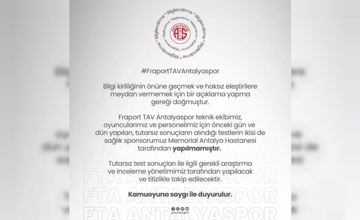“Bilgi kirliliğinin önüne geçmek ve haksız eleştirilere meydan vermemek için bir açıklama yapma gereği doğmuştur. Antalyaspor teknik ekibimiz, oyuncularımız ve personelimiz için önceki gün ve dün yapılan, tutarsız sonuçların alındığı testlerin ikisi de sağlık sponsorumuz Memorial Antalya Hastanesi tarafından yapılmamıştır. Tutarsız test sonuçlarıyla ilgili gerekli araştırma ve inceleme yönetimimiz tarafından yapılacak ve titizlikle takip edilecektir.”