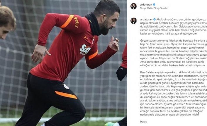 Galatasaray Kaptanı Arda Turan, geri dönüşü zor bir sakatlık geçirdiğini belirterek, "Aylarca gösterilen tüm fedakarlığın, birlikte çalıştığım insanların gösterdiği büyük çabanın, emeğin sonucu; farklı bir açıdan çekilen bir fotoğraf neticesinde oluşturulan ucuz bir popülizm midir? Hayır. Bunun böyle olmadığını da herkese, tüm kariyerim boyunca yaptığım gibi çok çalışarak yeniden hatırlatacağım. Galatasaray için mücadele vermekten geri durmayacağım" dedi.