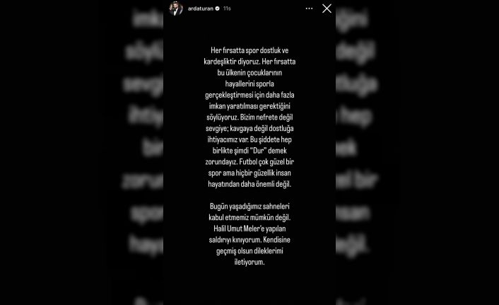 Eyüpspor Teknik Direktörü Arda Turan, MKE Ankaragücü Başkanı Faruk Koca’nın, hakem Halil Umut Meler’e yaptığı fiziksel saldırı sonrası kınama mesajı yayımladı.