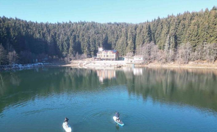 Suda yüzen tahtaların üzerinde duran kürekli sörfçüler, çevresi beyaza bürünmüş Karagöl üzerinde kürek çektiler. Soğuk havaya aldırmadan sörfün tadını çıkardılar.