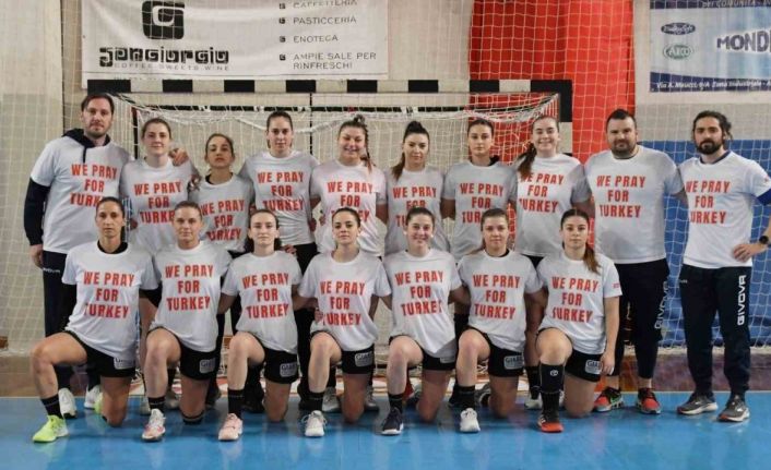 Milli hentbolcu Ayşenur Sormaz’ın da formasını giydiği İtalyan Ariosto Pallamano Ferrara Takımı, Erice ile oynanan maç öncesi depremzedeleri anmak için ’Türkiye için dua ediyoruz’ yazılı tişörtler ile parkeye çıktı.